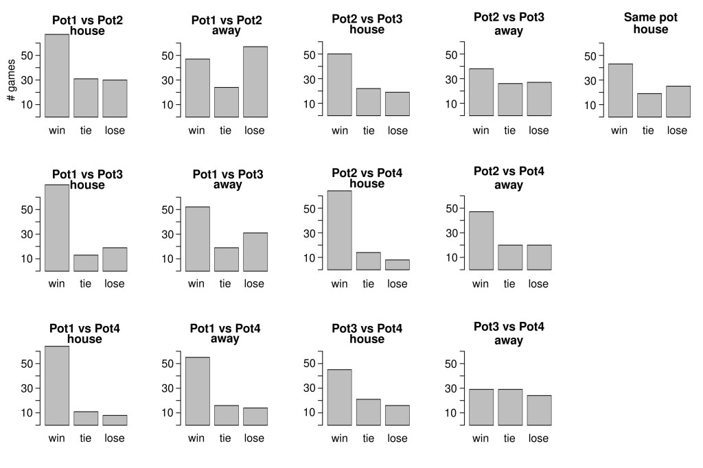 Esta aproximación hace que Madrid y Bayern, por ejemplo, tengan la misma probabilidad de ganar, empatar o perder cada partido, ya que pertenecen al mismo bombo. Si la idea es predecir el desempeño de cada equipo, claramente este enfoque no es el mejor. En nuestro caso, la motivación es estimar cuántos puntos se necesitan para clasificar entre los 8 o 24 primeros, así como generar clasificaciones raras (ver más abajo), sin importarnos demasiado los equipos de manera individual.