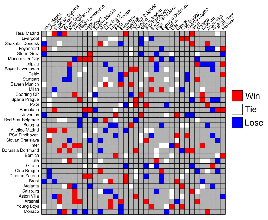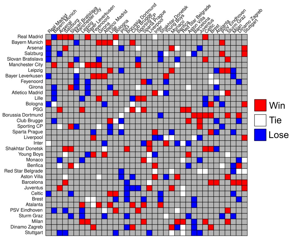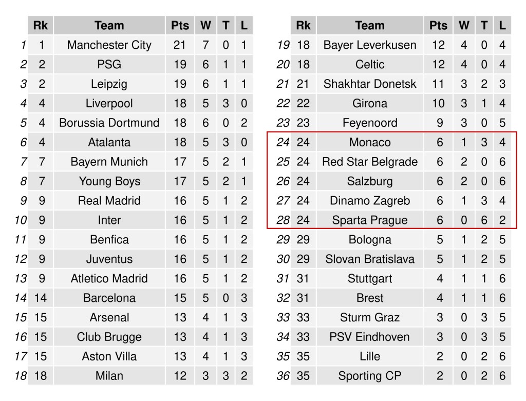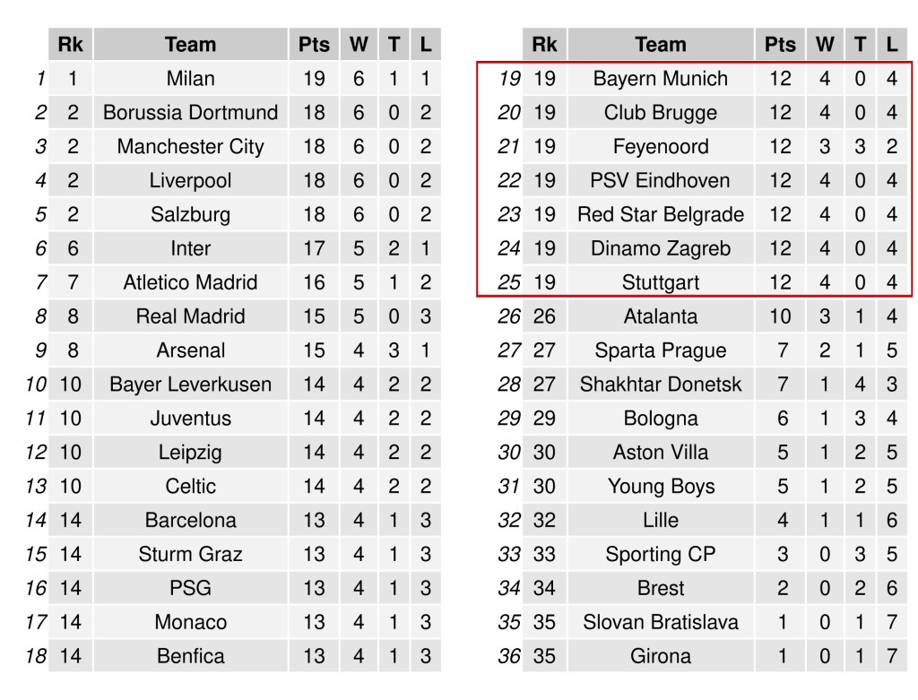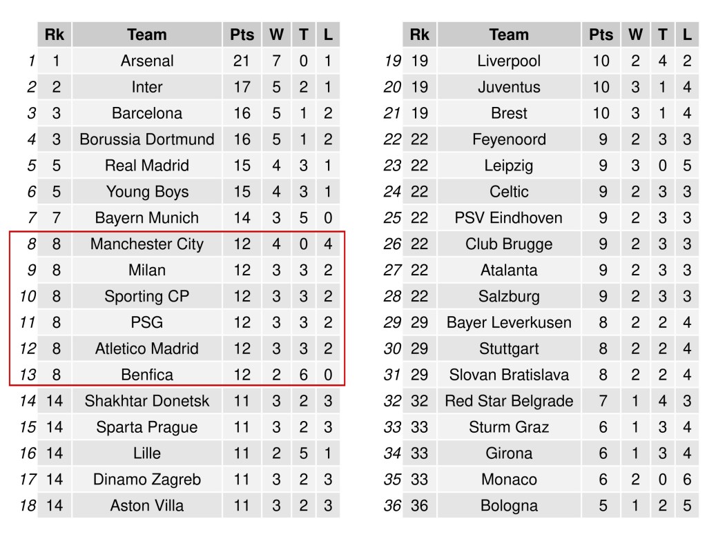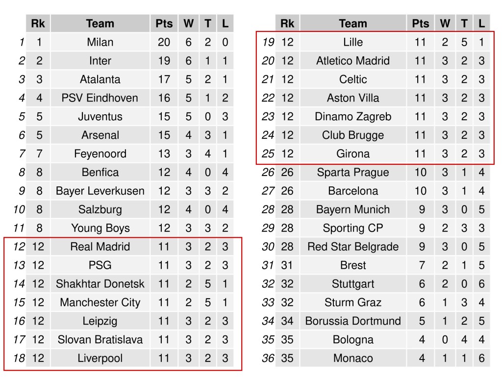 El curso pasado, la UEFA cambió el formato de la fase de grupos de sus tres competiciones internacionales. De grupos cerrados en los que cuatro equipos (uno de cada bombo) se enfrentaban todos contra todos a ida y vuelta durante seis jornadas, se pasó a un sistema de clasificación única en el que cada equipo se enfrenta a ocho oponentes (dos por bombo) una sola vez. De esta forma, los ocho primeros clasificados pasan directamente a los octavos de final, mientras que los clasificados entre el puesto noveno y el vigésimo cuarto juegan una eliminatoria adicional. Una de las preguntas abiertas en este nuevo sistema tiene que ver con los puntos necesarios para clasificar entre los 8 y los 24 primeros puestos. Para ello, OPTA y Football Meets Data calcularon estimaciones generando 50,000 y 10,000 simulaciones, respectivamente. Ambos análisis coincidieron en que 10 puntos (e incluso 9) debería ser suficiente en la mayoría de los casos para entrar en el top24, aunque la primera clasificación con este nuevo sistema dejó fuera a Dinamo Zagreb y Stuttgart con 11 y 10 puntos cada uno. En principio, el número de simulaciones parece razonable para estimar las clasificaciones más probables, pero seguramente haya casos más exóticos que no están contemplados en estos análisis por el simple hecho de que son más improbables que 1 entre 50k o 1 entre 100k…y esos casos son siempre los más interesantes para los frikis del fútbol. Para cazar esas rarezas hay que redoblar la apuesta, así que hemos generado 5 millones de simulaciones, desde el sorteo hasta los resultados y la clasificación final. Explicamos aquí el proceso paso a paso. Por cierto, si escribes «rareza» en google te sale el primo de Bellerín.