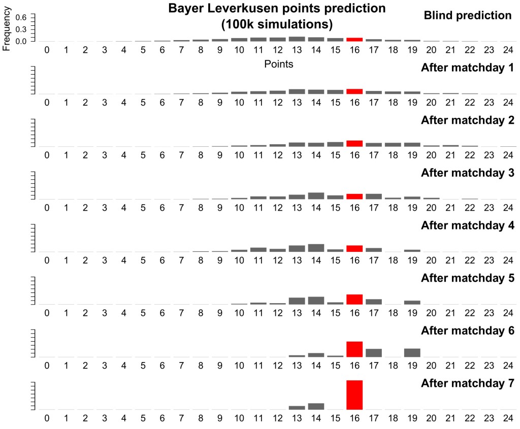 Antes de generar las 5 millones de simulaciones, vamos a hacer una prueba para ver cómo funciona el sistema. Generamos 100 mil simulaciones y contrastamos las predicciones con los resultados de la temporada 2024-25, que es la única para la que existen datos hasta el momento. Un análisis interesante (aunque no sea nuestro propósito) es partir del sorteo de dicha temporada y proyectar el número total de puntos que sumará cada equipo al final de la fase liga. Esto lo haremos tanto «a ciegas» (prediciendo todas las jornadas) como después de haber transcurrido cada jornada, lo que nos permite testar hasta qué punto el sistema va convergiendo a la clasificación real a medida que reducimos el número de partidos a predecir. Dado que nuestro sistema sólo tiene en cuenta el bombo al que pertenece cada equipo, las predicciones a ciegas de los equipos del mismo bombo son similares. Esto hace que, si un equipo no se comporta como se esperaría, las primeras predicciones no sean precisas. Para ilustrar esto, analizamos las predicciones de Bayer Leverkusen y Mónaco, que se comportaron de forma distinta respecto a lo esperado. El primero obtuvo 16 puntos y acabó 6º siendo del bombo 1, por lo que se desempeñó como se podía prever. En la siguiente gráfica podemos ver las frecuencias con que el sistema asigna el número final de puntos del Bayer Leverkusen: