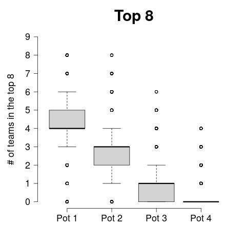 Otro aspecto interesante que podemos extraer de nuestro análisis es la frecuencia con la que los equipos de cada bombo se clasifican entre los 8 o 24 primeros. Tras las primeras propuestas de la superliga, que garantizaban la participación ad eternum de los equipos más ricos de Europa, el nuevo formato de la UCL fue visto por muchos como una concesión de la UEFA a estos equipos. El aumento del número de partidos en la fase liga (de 6 a 8) y la clasificación a las eliminatorias de 2 de cada 3 equipos participantes (por el 50% del formato anterior) aseguraban a los más ricachones disputar un número mínimo de partidos y trincar unos ricos billets. De entre todos los análisis que estoy vomitando en esta entrada, estoy seguro de que éste en concreto (o uno parecido) fue rigurosamente considerado por la UEFA en cada uno de los bocetos de nuevo formato para garantizar un torneo en el que ningún gerifalte se quedara fuera de las eliminatorias. Los diagramas de caja de abajo muestran el número de equipos de cada bombo que, tras las 5 millones de simulaciones, clasifican en el top 8 y el top 24:
