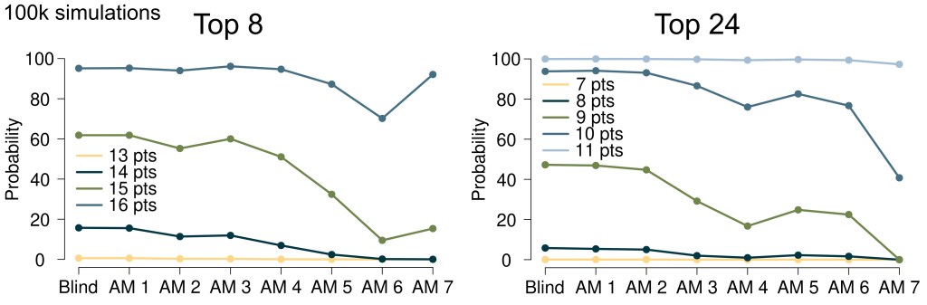Como vemos, la ventana entre los 14 y los 16 puntos marca el umbral para entrar en el top 8 (con interesantísimas excepciones). Aunque nuestras probabilidades son por lo general algo más bajas que las de OPTA, ambas señalan dicha ventana como límite inferior. Curiosamente, damos un 62.7% de probabilidades a clasificar en el top 8 con 15 puntos (OPTA da un 73%), cuando finalmente hicieron falta 16. En cuanto al top 24, el rango entre los 8 y los 10 puntos marca el límite inferior (de nuevo con excepciones interesantes). Nuestras estimaciones son parecidas a las de OPTA y las de Football Meets Data, aunque no tan optimismas respecto a los puntos que bastan para clasificar. Esto parece ajustarse más a lo que acabó pasando el pasado curso, pero poco podemos afirmar con un sólo ejemplo.
