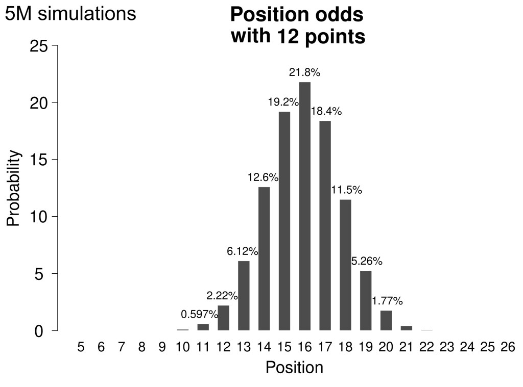 En el 73% de las simulaciones, conseguir 11 puntos te lleva a ocupar un puesto entre el 17 y el 20, mientras que el 72% de las veces conseguir 12 puntos te haría acabar entre el 14 y el 18.